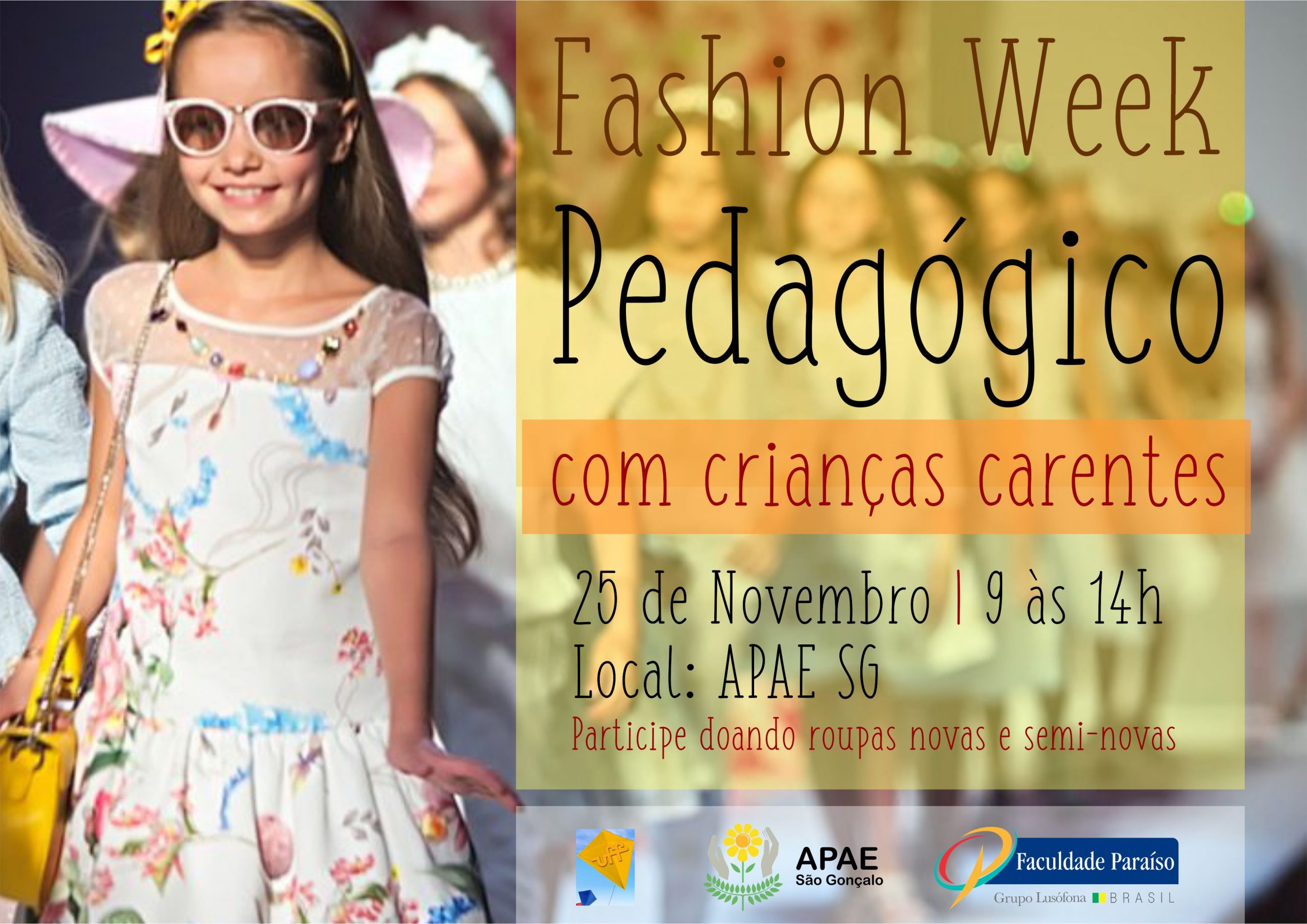 A Coordenação do Curso de Pedagogia e Letras está promovendo o Fashion Week Pedagógico, que será realizado no dia 25 de Novembro, de 9 às 14h, na APAE de São Gonçalo.“A iniciativa partiu de um Projeto de uma de nossas alunas, Ana Figueiredo, formada em Moda e estudante do 4º período de Pedagogia, que teve a …